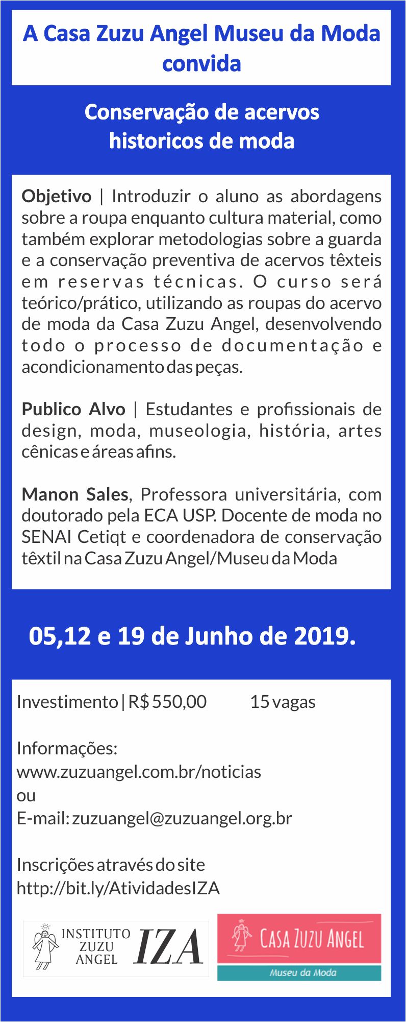 Pré-requisitos : Necessário o interesse pelo tema, formação ou experiência na área de moda, museologia, história, conservação e áreas afins.